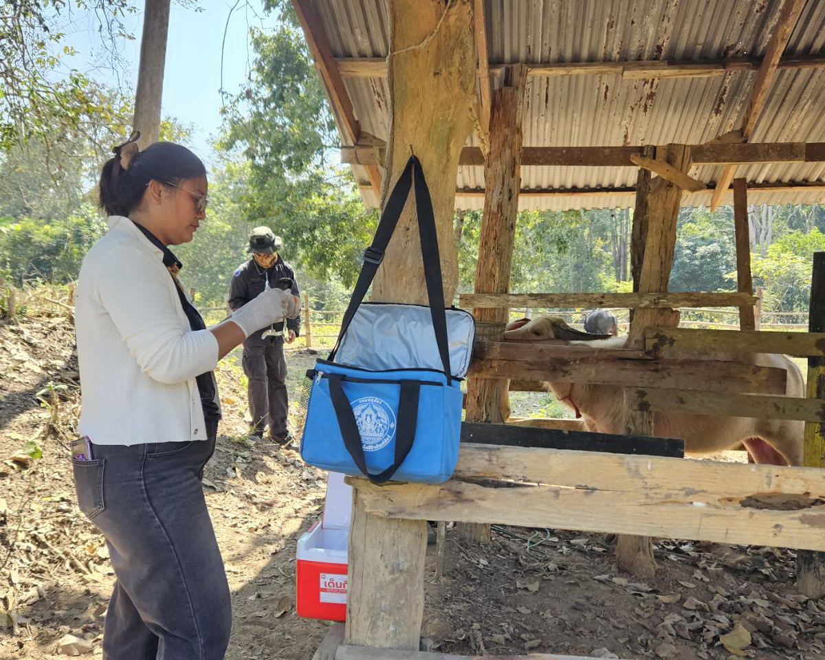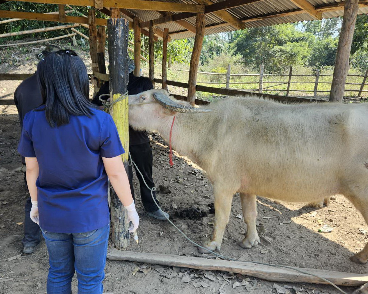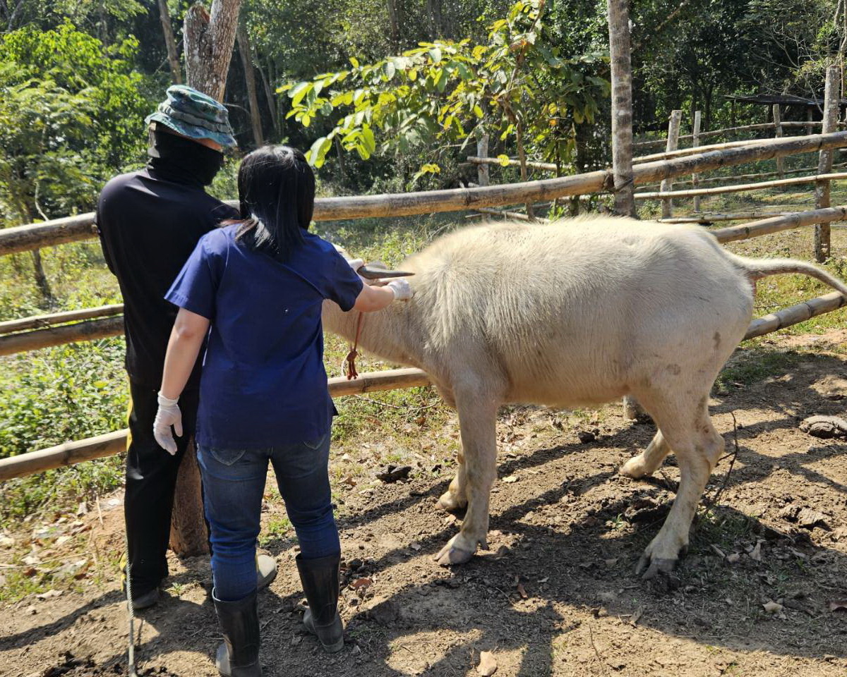 วันที่ 13 มกราคม 2569 เวลา 13.00 น. นายอดิเรก จันทะศิลา ปศุสัตว์อำเภอโป่งน้ำร้อน มอบหมายให้ นางสาววลีรัตน์ อินทเวช เจ้าพนักงานสัตวบาล และนางสาวพันทิวา สีชมภู จ้างเหมาบริการช่วยงานด้านสัตวแพทย์ ร่วมกับปศุสัตว์อำเภอสอยดาว ลงพื้นที่หมู่ 1 ต.โป่งน้ำร้อน อ.โป่งน้ำร้อน จ.จันทบุรี ให้บริการฉีดวัคซีนป้องกันโรคปากและเท้าเปื่อยในกระบือ จำนวนเกษตรกร 1 ราย กระบือจำนวน 11 ตัว และสนตะพายกระบือ เพื่อการบังคับลากจูง จำนวน 2 ตัว พร้อมมอบน้ำยาฆ่าเชื้อโรค ให้ฉีดพ่นพื้นคอกบริเวณที่สัตว์พักอาศัย ให้คำแนะนำในการดูแลสุขภาพสัตว์ช่วงอากาศเปลี่ยน