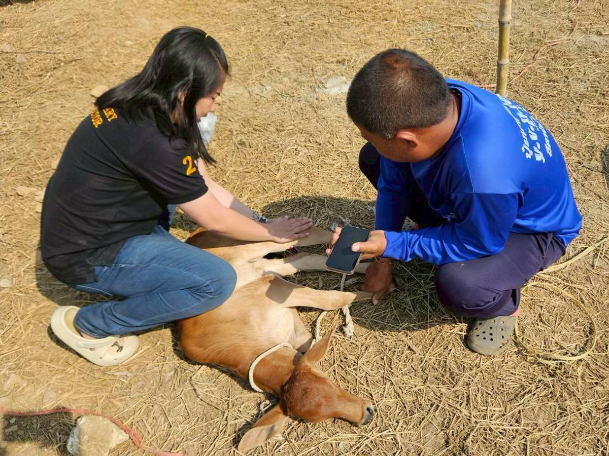 วันที่ 9 มกราคม 2569 เวลา 10.00 น. นายอดิเรก จันทะศิลา ปศุสัตว์อำเภอโป่งน้ำร้อน มอบหมายให้ นางสาววลีรัตน์ อินทเวช เจ้าพนักงานสัตวบาล และนางสาวพันทิวา สีชมภู จ้างเหมาบริการช่วยงานด้านสัตวแพทย์ลงพื้นที่ม.4 ต.เทพนิมิต ตรวจเยี่ยมเกษตรกรผู้เลี้ยงโคเนื้อ โครงการธนาคารโค-กระบือ เพื่อเกษตรกรตามพระราชดำริ (ธคก.) เกษตรกร 2 ราย โคเนื้อ 10 ตัว พร้อมรักษาพยาบาลเบื้องต้นลูกโคเนื้อขาเจ็บ เนื่องจากถูกตัวใหญ่ในฝูงเหยียบ แนะนำการแยกแม่ลูกอ่อนพร้อมลูกออกจากฝูงเพื่อป้องกันลูกโคถูกเหยียบ พร้อมเน้นย้ำเฝ้าระวังป้องกันโรค