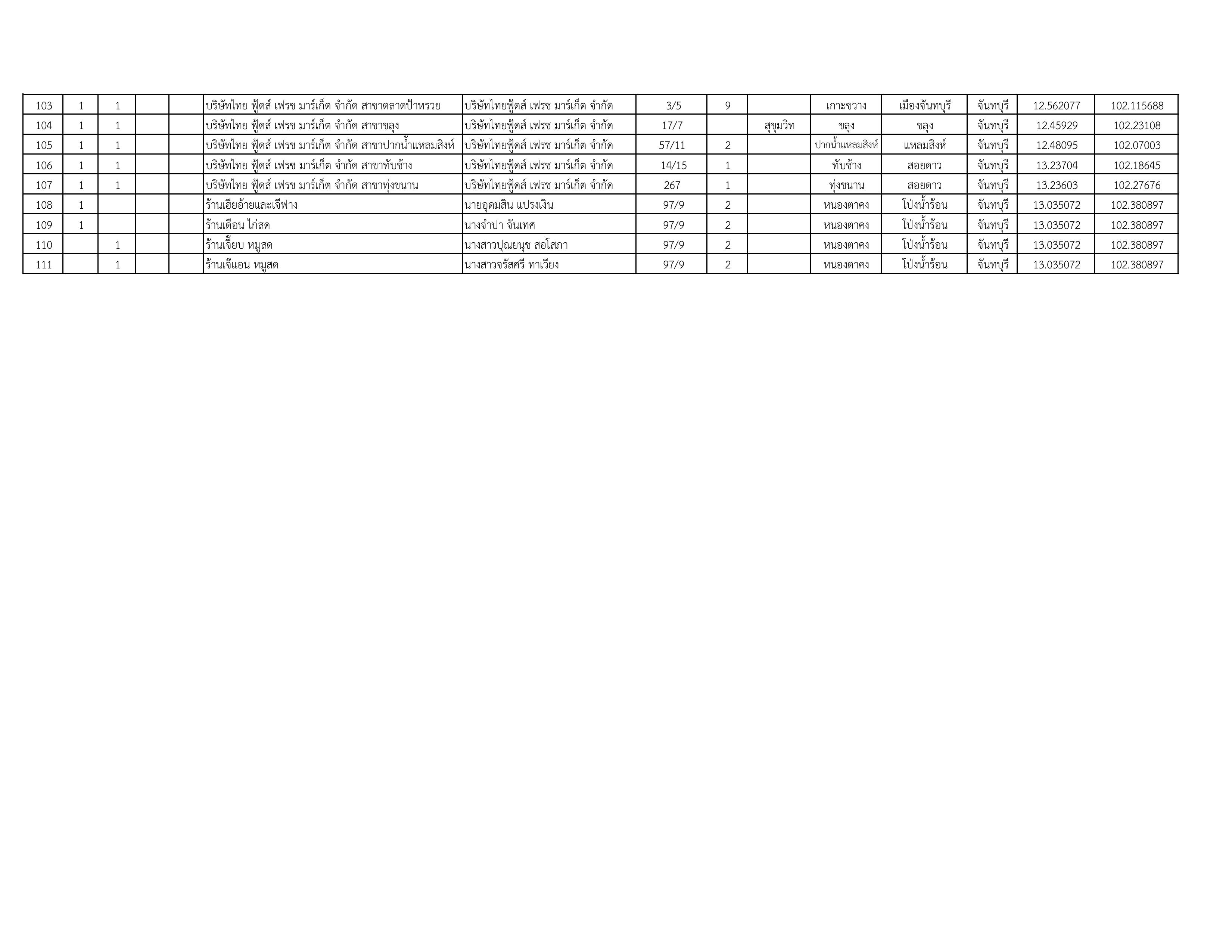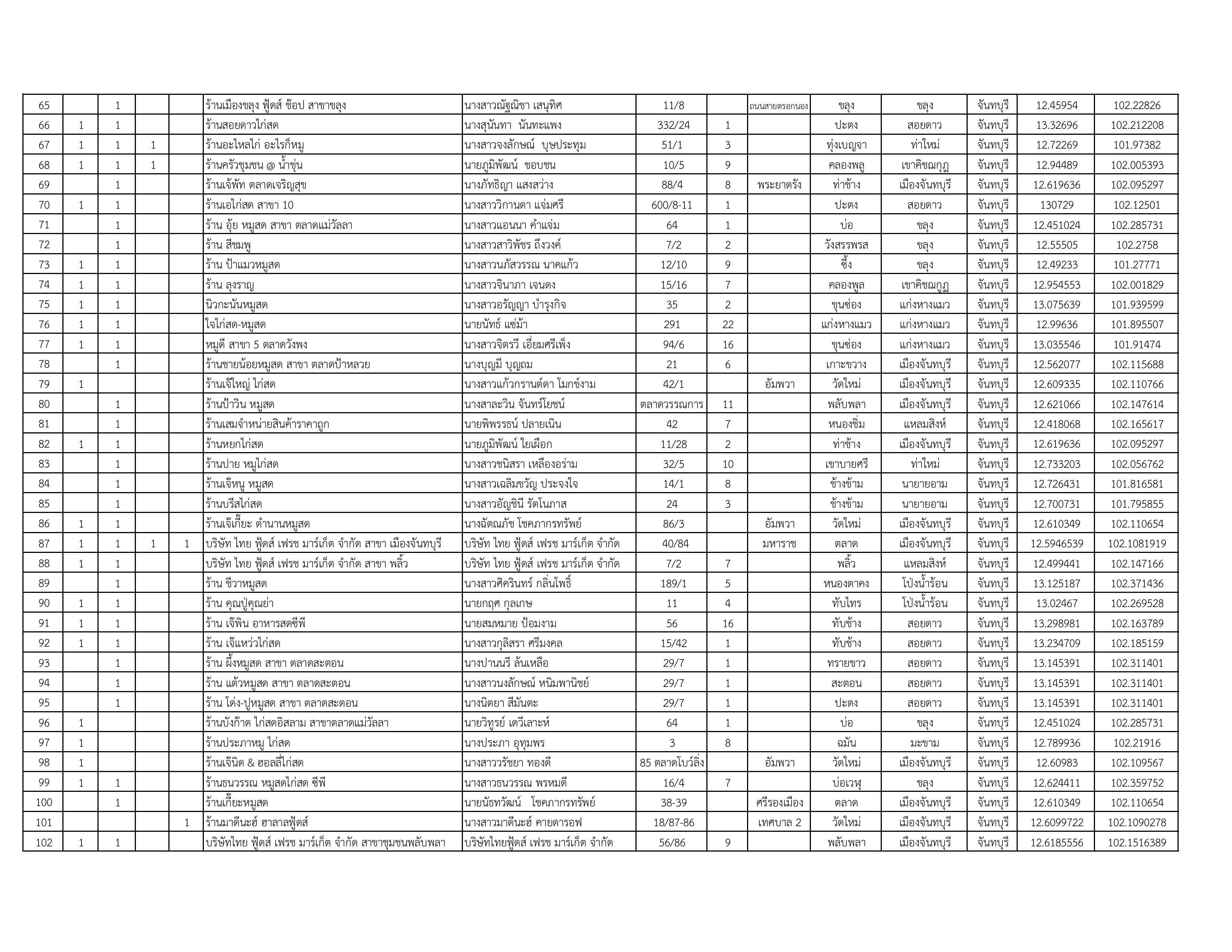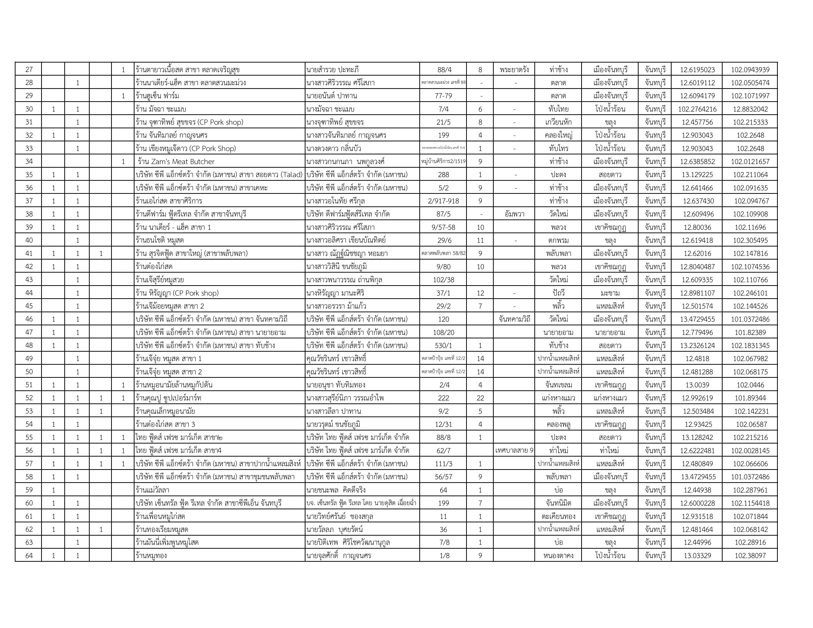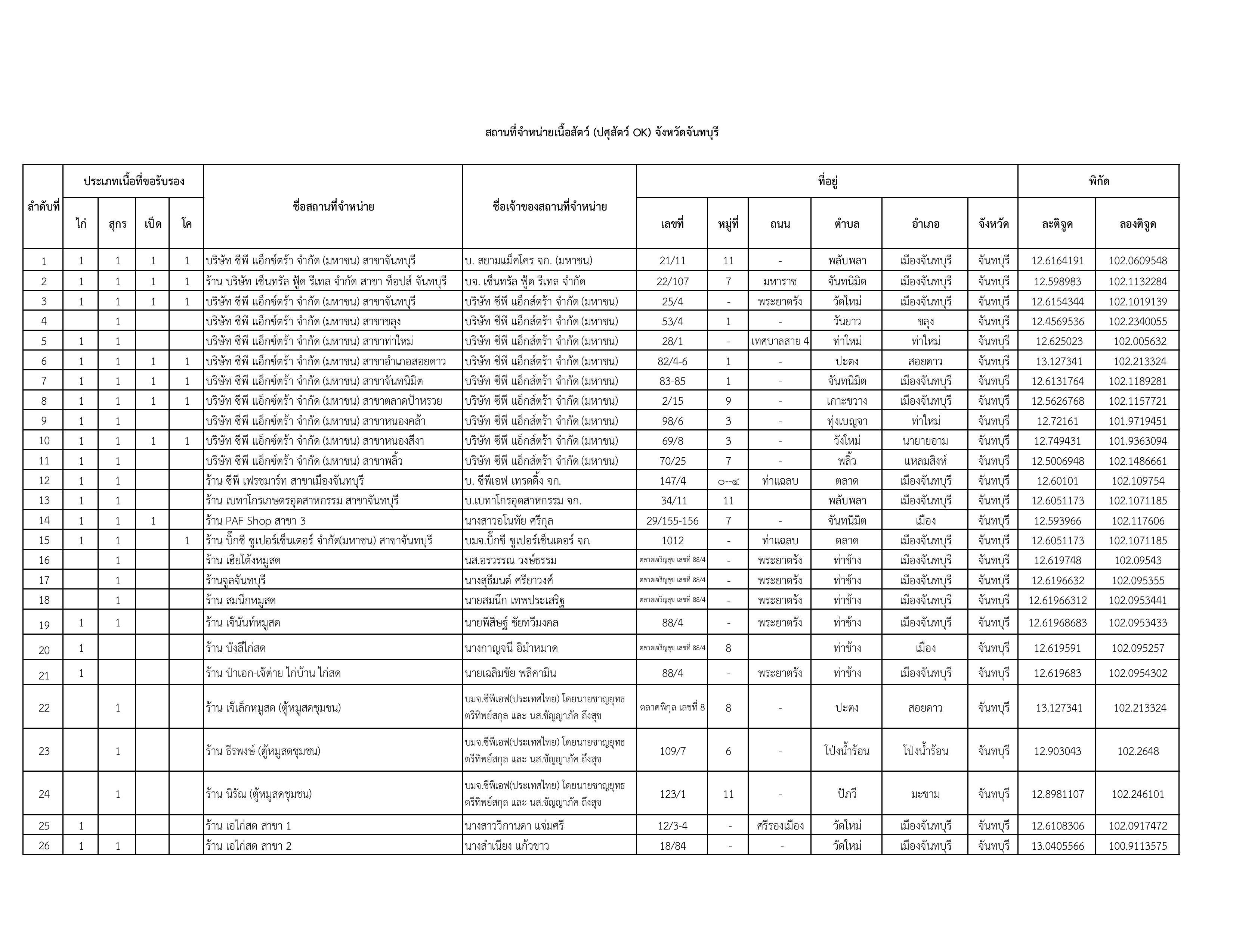 รายชื่อสถานที่จำหน่ายเนื้อสัตว์ที่ได้รับการรับรองโครงการเนื้อสัตว์ปลอดภัย ใส่ใจผู้บริโภค (ปศุสัตว์ OK) ในจังหวัดจันทบุรี