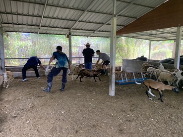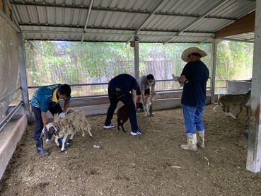 เจ้าหน้าที่สำนักงานปศุสัตว์อำเภอหนองใหญ่ดำเนินการฉีดวัคซีนป้องกันโรคปากและเท้าเปื่อย ในกระบือ แกะในพื้นที่ ต.ห้างสูง อ.หนองใหญ่ จ.ชลบุรี วันที่ 6 พฤศจิกายน 2568
