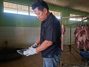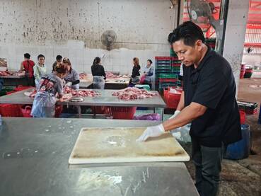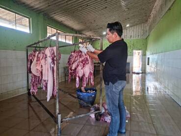 เจ้าหน้าที่สำนักงานปศุสัตว์อำเภอพนัสนิคม ดำเนินการเก็บตัวอย่าง surface swab ในโรงฆ่าสุกร พื้นที่อำเภอพนัสนิคม จังหวัดชลบุรี วันที่ 4 ธันวาคม 2568