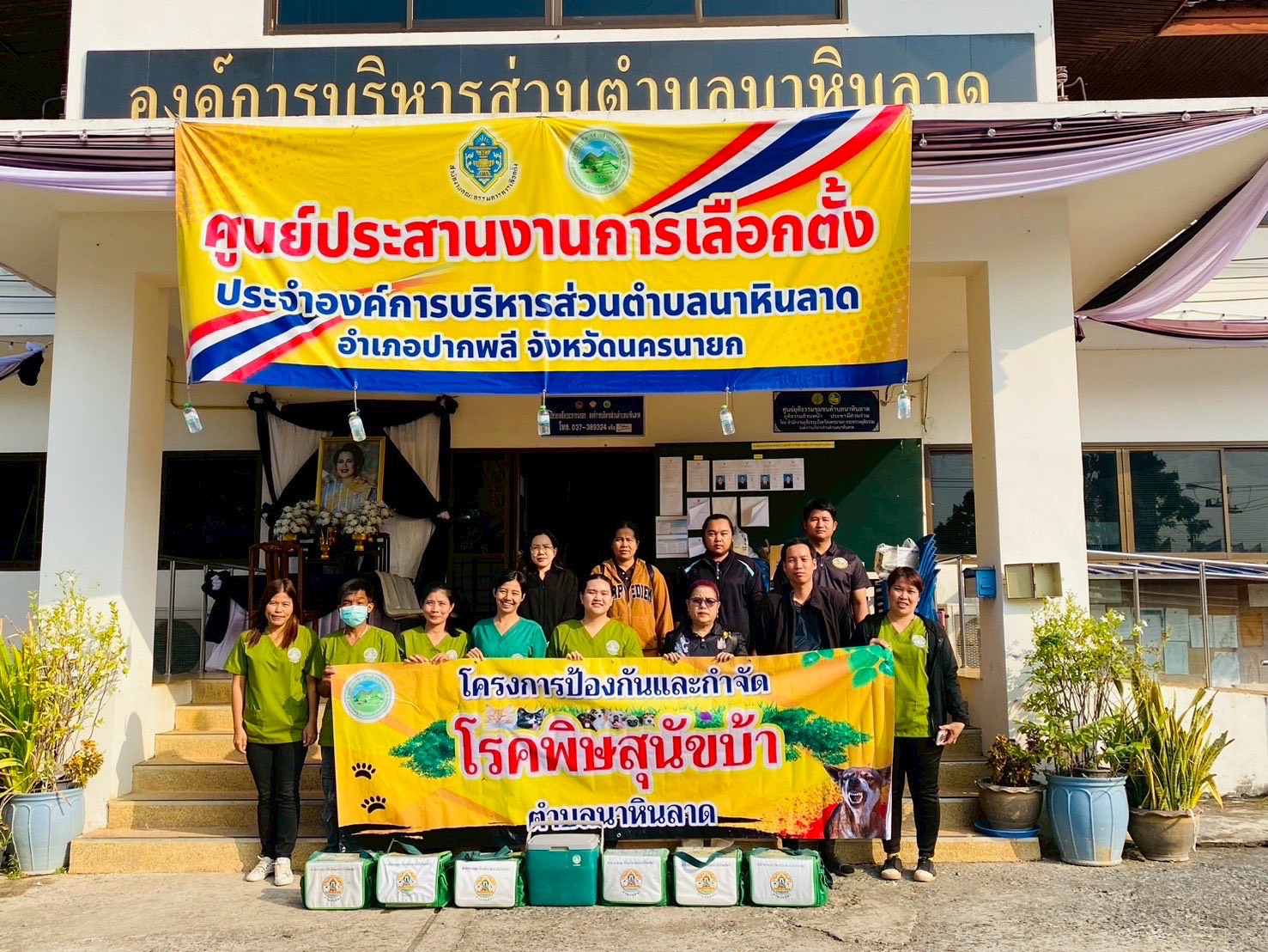 วันที่ 9 กุมภาพันธ์ 2569 สำนักงานปศุสัตว์อำเภอปากพลีร่วมกับองค์การบริหารส่วนตำบลนาหินลาด รณรงค์ฉีดวัคซีนป้องกันโรคพิษสุนัขบ้า ประจำปี 2569 ภายใต้ยุทธศาสตร์แผนการดำเนินโครงการสัตว์ปลอดโรค คนปลอดภัย จากโรคพิษสุนัขบ้า ลงพื้นที่ฉีดวัคซีนป้องกันโรคพิษสุนัขบ้าให้สุนัข แมว ในเขตพื้นที่รับผิดชอบขององค์การบริหารส่วนตำบลนาหินลาด อำเภอปากพลี หมู่ที่ 1-7 รวม 7 หมู่บ้าน โดยดำเนินการฝึกอบรมถ่ายทอดความรู้เกี่ยวกับโรคพิษสุนัขบ้า วิธีการจับและบังคับสุนัข และแมวรวมทั้งการฉีดวัคซีนป้องกันโรคพิษสุนัขบ้า อย่างถูกวิธีให้สุนัข 643 ตัว แมว 657 ตัว รวม จำนวนทั้งหมด 1,300 ตัว