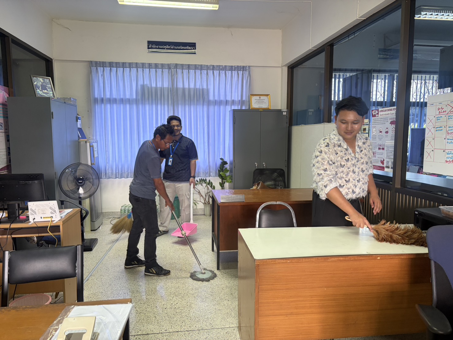 วันที่ 22 เมษายน 2569 เวลา 08.30 น. นายสัตวแพทย์ไทยวิวัฒน์ วรรณสุข ปศุสัตว์จังหวัดระยอง พร้อมด้วย นางสุภาวดี สุขีถาน หัวหน้าฝ่ายบริหารทั่วไป นางสาวณัฐนันท์ ประเสริฐ หัวหน้ากลุ่มพัฒนาสุขภาพสัตว์ นางสาวสุภลักษณ์ ตันประยูร หัวหน้ากลุ่มพัฒนาคุณภาพสินค้าปศุสัตว์ นายพิรพัตร์ ช่วยทอง หัวหน้ากลุ่มยุทธศาสตร์และสารสนเทศการปศุสัตว์ นายอภิณัฐ มะกรวัฒนะ นายสัตวแพทย์ชำนาญการ รักษาการแทนปศุสัตว์อำเภอเมืองระยอง นายเจษฎิภัทท์ คำเบา ปศุสัตว์อำเภอบ้านฉาง นายกฤตเมธ รมณียจิตโต ปศุสัตว์อำเภอบ้านค่าย และเจ้าหน้าที่สำนักงานปศุสัตว์จังหวัดระยอง ดำเนินกิจกรรมเข้าแถวเคารพธงชาติ และสวดมนต์ พร้อมรับมอบนโบายในการดำเนินการปรับปรุงสภาพแวดล้อมในการทำงาน และดำเนินกิจกรรม 5 ส (Big Cleaning Day) เพื่อปรับปรุงสภาพแวดล้อมในการทำงาน ภายในและภายนอกสำนักงานปศุสัตว์จังหวัดระยอง และสำนักงานปศุสัตว์อำเภอทั้ง 8 แห่ง ณ สำนักงานปศุสัตว์จังหวัดระยอง ตำบลเนินพระ อำเภอเมืองระยอง จังหวัดระยอง
