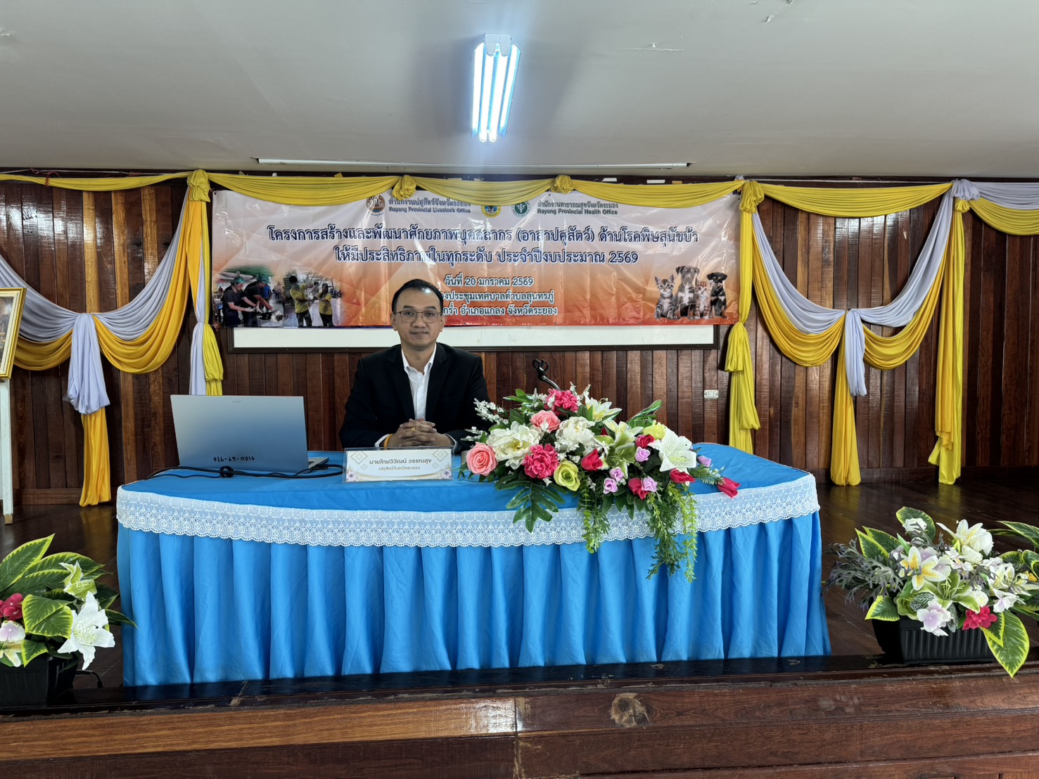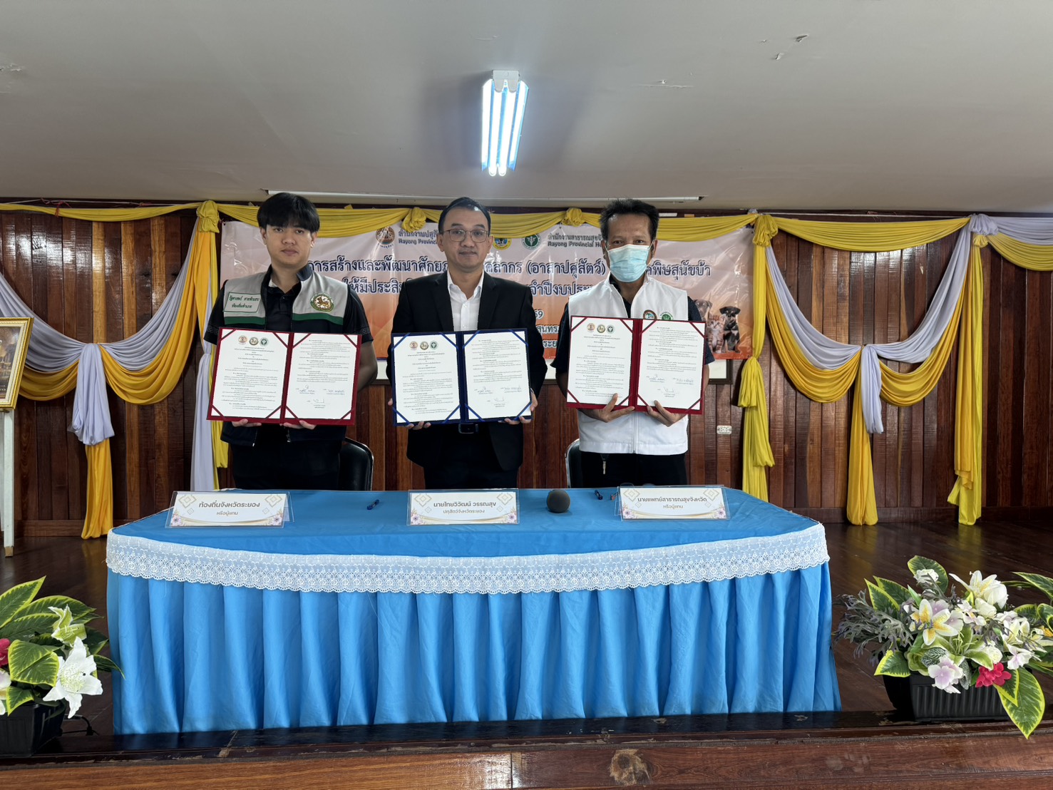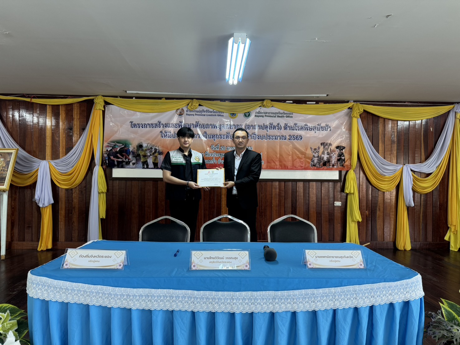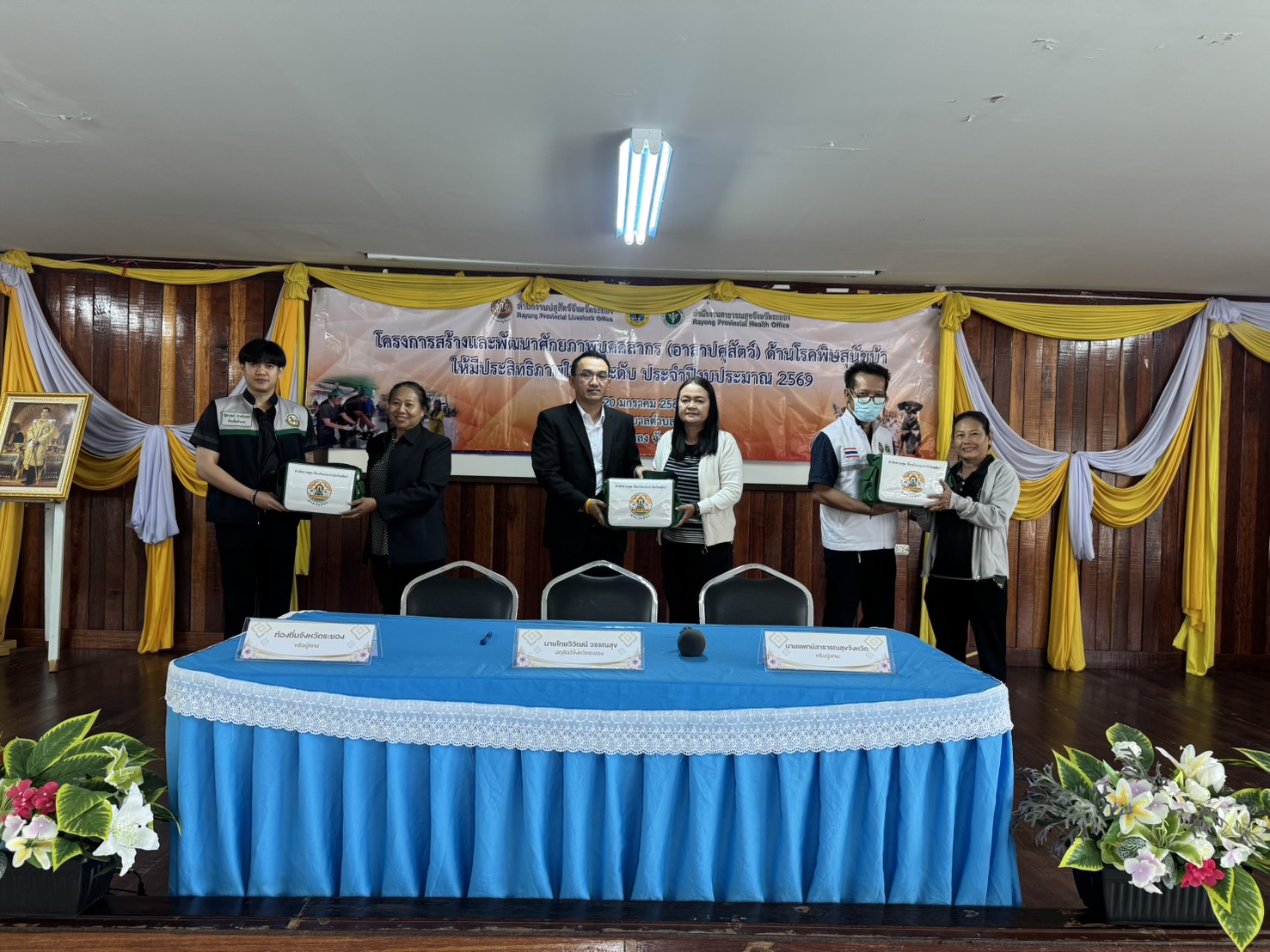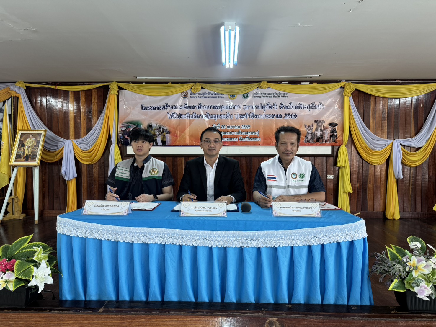 วันที่ 20 มกราคม 2569 เวลา 09.30 น. สำนักงานปศุสัตว์จังหวัดระยอง จัดโครงการฝึกอบรมเพื่อสร้างและพัฒนาศักยภาพอาสาปศุสัตว์ด้านโรคพิษสุนัขบ้า จังหวัดระยอง ปีงบประมาณ 2569 ภายใต้แผนยุทธศาสตร์การดำเนินโครงการสัตว์ปลอดโรค คนปลอดภัยจากโรคพิษสุนัขบ้าตามพระปณิธานศาสตราจารย์ ดร.สมเด็จเจ้าฟ้าฯ กรมพระศรีสวางควัฒน วรขัตติยราชนารี โดยมีนายสัตวแพทย์ไทยวิวัฒน์ วรรณสุข ปศุสัตว์จังหวัดระยอง เป็นประธาน พร้อมด้วย สัตวแพทย์หญิงณัฐนันท์ ประเสริฐ นายสัตวแพทย์ชำนาญการพิเศษ หัวหน้ากลุ่มพัฒนาสุขภาพสัตว์ และเจ้าหน้าที่กลุ่มพัฒนาสุขภาพสัตว์ ร่วมกับสำนักงานสาธารณสุขจังหวัดระยอง และสำนักงานส่งเสริมการปกครองส่วนท้องถิ่นจังหวัดระยอง จัดฝึกอบรมอาสาปศุสัตว์ด้านโรคพิษสุนัขบ้าแก่อาสาฯที่คัดเลือกจากองค์กรปกครองส่วนท้องถิ่นในพื้นที่ อำเภอแกลง โดยบรรยายถ่ายทอดความรู้เกี่ยวกับเรื่องโรคพิษสุนัขบ้า วิธีการจับและบังคับสุนัขและแมว รวมทั้งสาธิตการฉีดวัคซีนป้องกันโรคพิษสุนัขบ้าอย่างถูกวิธี พร้อมร่วมลงนามในบันทึกข้อตกลงความร่วมมือ(MOU)ระหว่างภาคีเครือข่ายว่าด้วยความร่วมมือการจัดกิจกรรมโครงการควบคุมป้องกันโรคพิษสุนัขบ้าโดยมีผู้เข้าร่วมอบรม จำนวน 170 ราย จาก 17 อปท. ณ อาคารหอประขุมเทศบาลตำบลสุนทรภู่ ตำบลชากพง อำเภอแกลง จังหวัดระยอง
