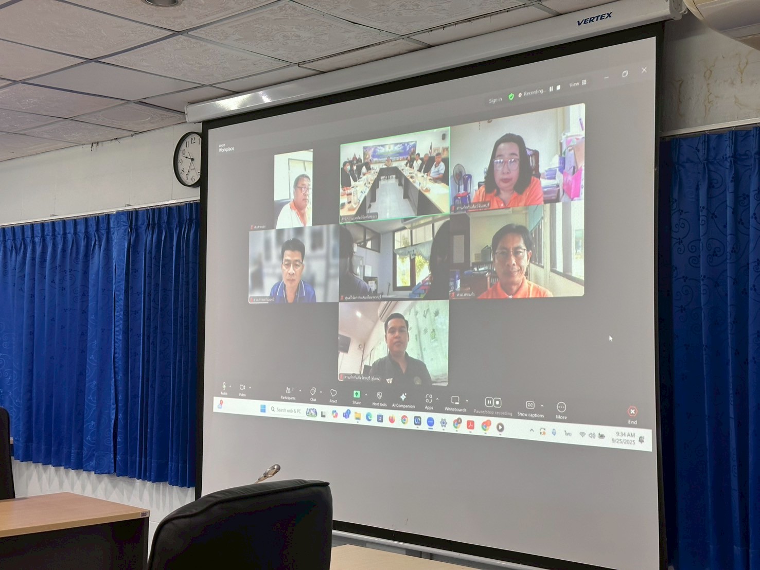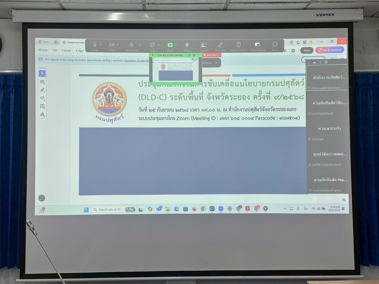 วันที่ 25 กันยายน 2568 เวลา 09.00 น. นายสัตวแพทย์ไทยวิวัฒน์ วรรณสุข ปศุสัตว์จังหวัดระยอง เป็นประธานการประชุมคณะกรรมการขับเคลื่อนนโยบายกรมปศุสัตว์ (DLD-C) ระดับพื้นที่จังหวัดระยอง และการประชุมข้าราชการและพนักงานราชการ ครั้งที่ 8/2568 ประจำเดือนสิงหาคม 2568 โดยมีหน่วยงานคณะกรรมการร่วมประชุม ได้แก่ ศูนย์วิจัยและพัฒนาการสัตวแพทย์ภาคตะวันออก ศูนย์วิจัยและบำรุงพันธุ์สัตว์ระยอง ศูนย์วิจัยและพัฒนาอาหารสัตว์สระแก้ว ศูนย์วิจัยการผสมเทียมและเทคโนโลยีชีวภาพชลบุรี ด่านกักกันสัตว์ชลบุรี และด่านกักกันสัตว์จันทบุรี พร้อมด้วย หัวหน้ากลุ่มพัฒนาคุณภาพสินค้าปศุสัตว์ กลุ่มพัฒนาสุขภาพสัตว์ กลุ่มส่งเสริมและพัฒนาการปศุสัตว์ กลุ่มยุทธศาสตร์และสารสนเทศการปศุสัตว์ ฝ่ายบริหารงานทั่วไป และปศุสัตว์อำเภอทั้ง 8 อำเภอ โดยรับทราบนโยบายการปฏิบัติ รับฟังผลการดำเนินงาน ปัญหา อุปสรรค ข้อเสนอแนะ และแนวทางการขับเคลื่อนงานตามภารกิจรับผิดชอบ ระเบียบและแผนการปฏิบัติการ การเร่งรัดเบิกจ่ายงบประมาณ ติดตามผลการปฏิบัติงานต่างๆ งานตามนโยบายเร่งด่วนของกรมปศุสัตว์และกระทรวงเกษตรและสหกรณ์ เพื่อสร้างความเข้าใจ ซักซ้อมแนวทางการดำเนินงานร่วมกัน อันจะเป็นการสนับสนุนและเพิ่มประสิทธิภาพในการปฏิบัติงานของเจ้าหน้าที่ในระดับพื้นที่ให้มากยิ่งขึ้น ผ่านระบบประชุมทางไกล Zoom Meeting และ ณ ห้องประชุมสำนักงานปศุสัตว์จังหวัดระยอง